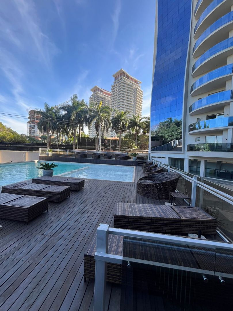 Departamento 2 Dormitorios en Mburucuyá, Paraguay Características: 125 m2 - 1 dormitorio principal en suite y vestidor - 1 dormitorio en Suite - 1 baño social - Cocina - incluye campana, Anafe, horno - Sala comedor - Balcón con parrilla - 1 cochera - en total 4 aires acondicionados Amenities: - Piscina climatizada - Sauna - Piscina en área abierta - Salón de evento, con baños y cocina - Gimnasio - Sector de lavandería comunes - Guardia de seguridad 24 horas - Circuito cerrado - Generador en áreas comunes Precio de Alquiler: Gs. 6.800.000 IVA y expensas incl.
